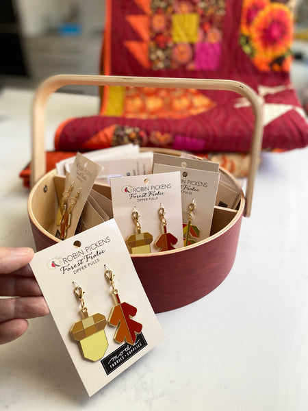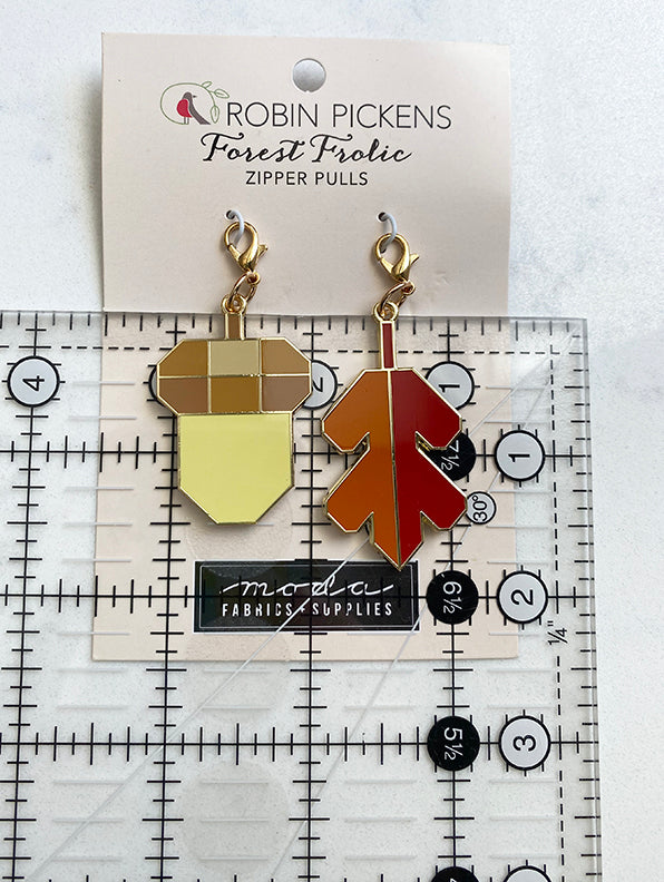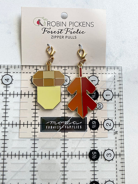 This is a pair of enamel zipper pulls to coordinate with the Forest Frolic fabric collection from Robin Pickens and Moda Fabrics. Pulls attach with a lobster hook and split ring. This pair of zipper pulls includes a 1.1 x 1.5" acorn and a 1 x 1.8" oak leaf. There is another set available with a mushroom and different leaf.