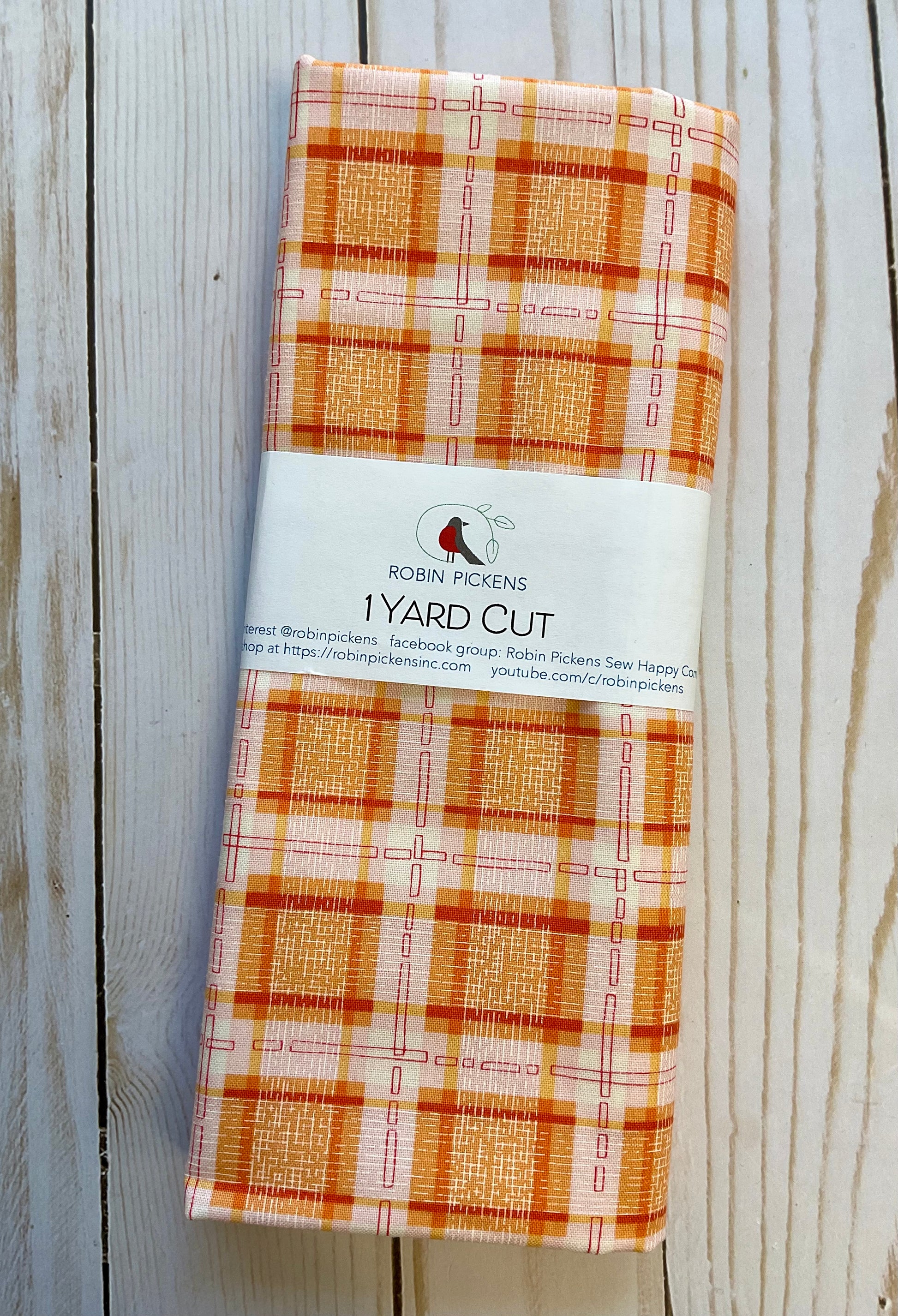 This one (1) yard cut from the Abby Rose collection designed by Robin Pickens for Moda fabrics is a design of light and dark orange checker on an orange background with pink accents.