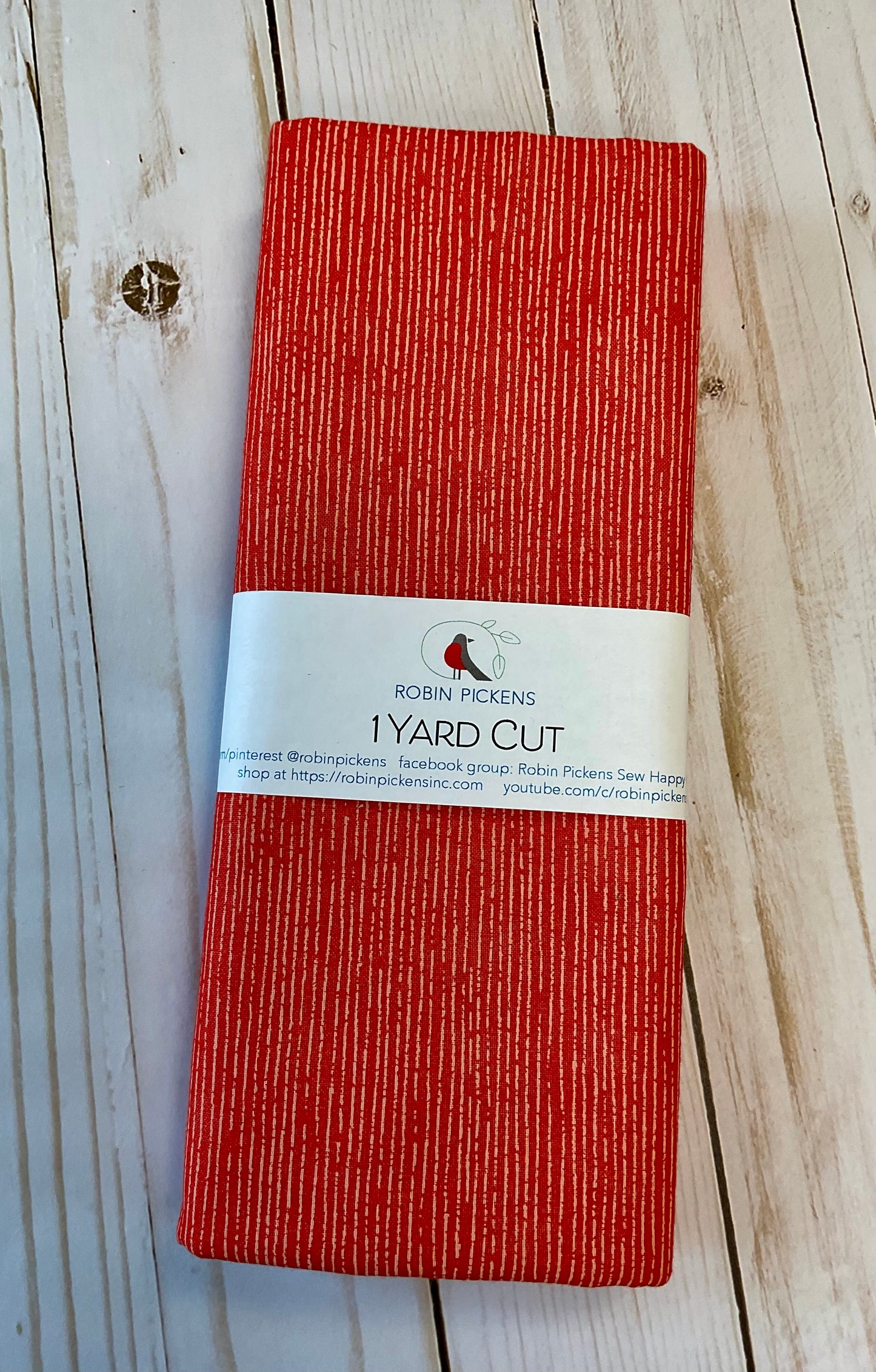 This one (1) yard cut from the Blushing collection designed by Robin Pickens for Moda fabrics is a design of pink stripes on a orange/red background.
