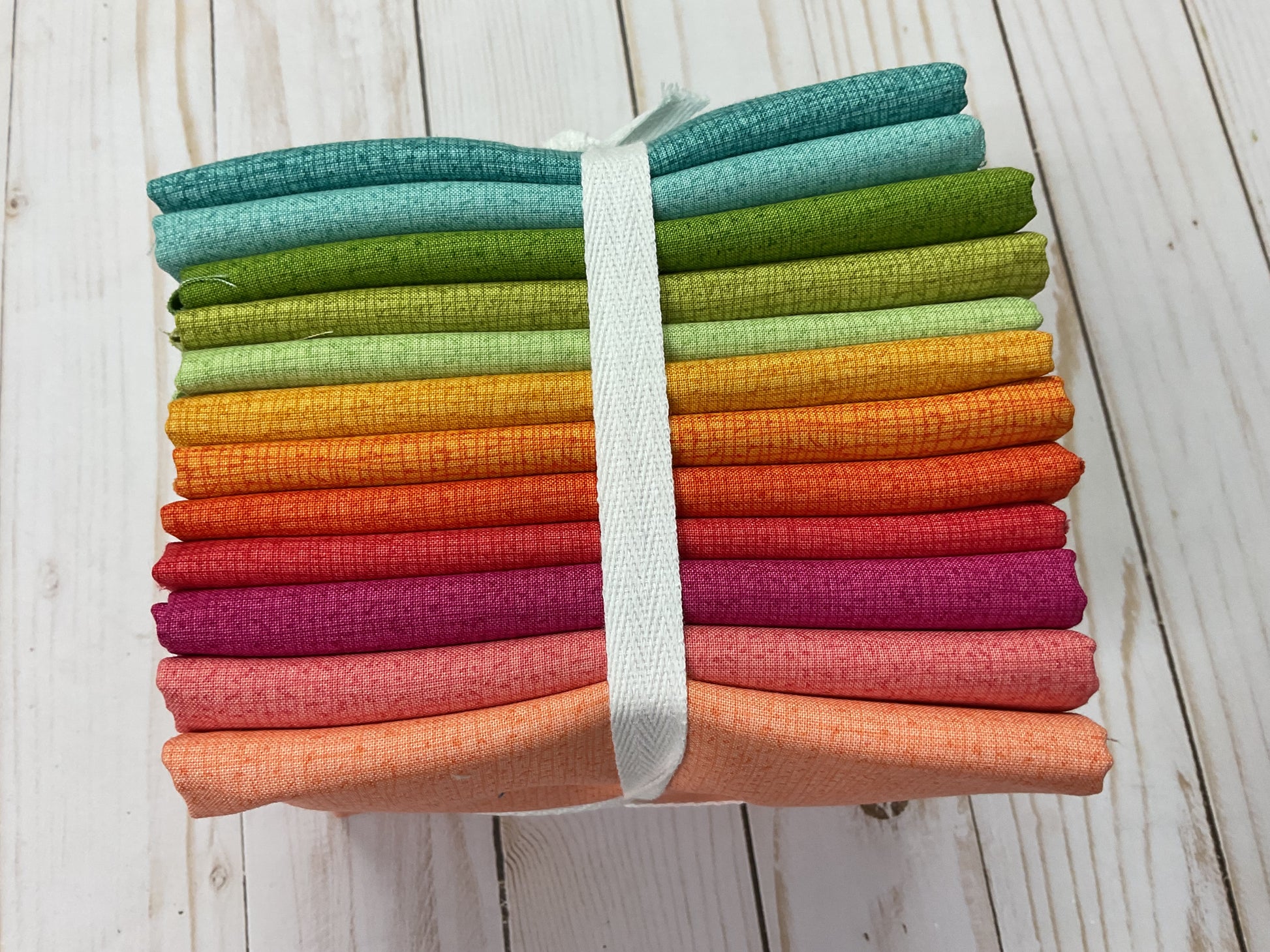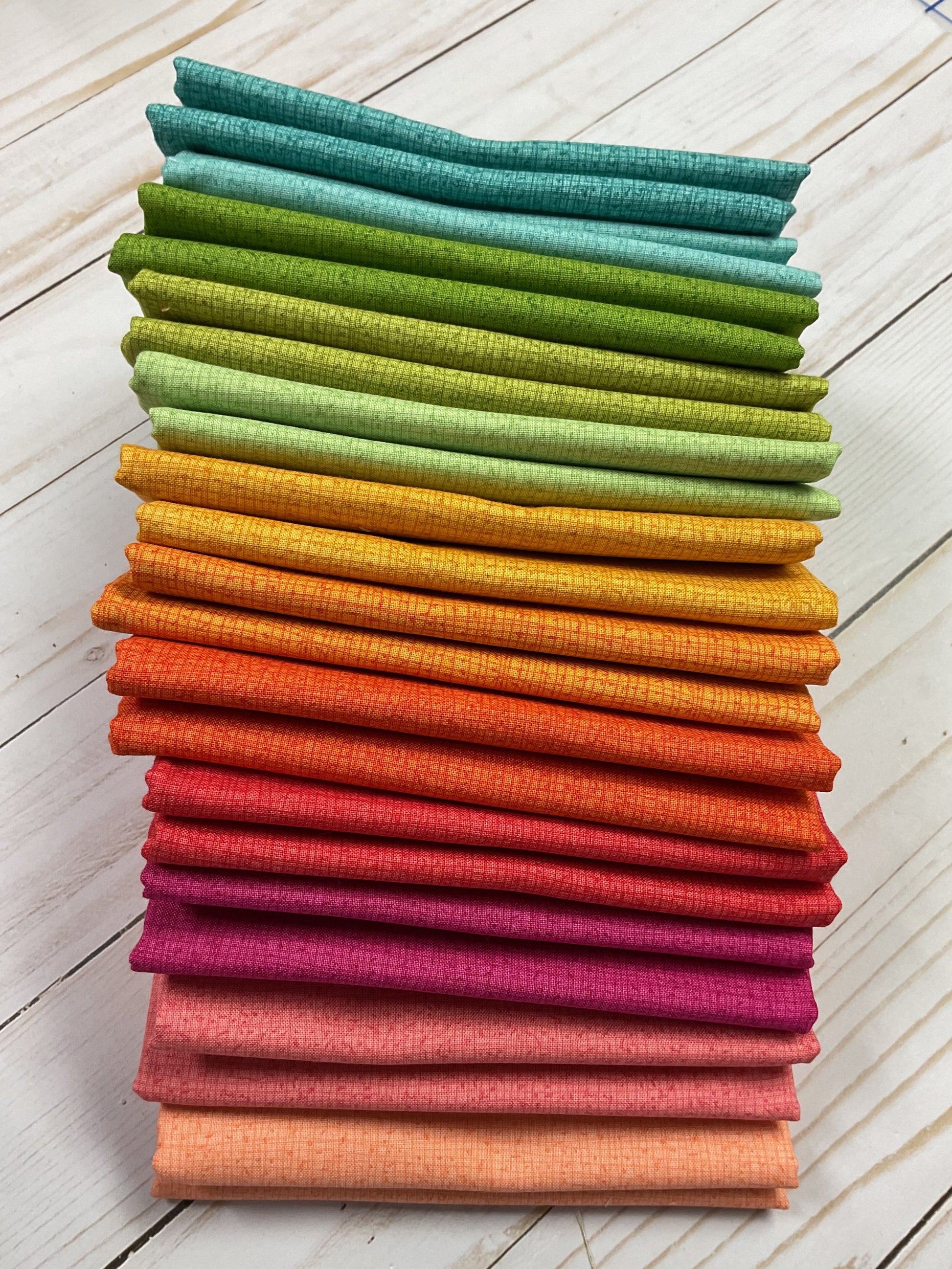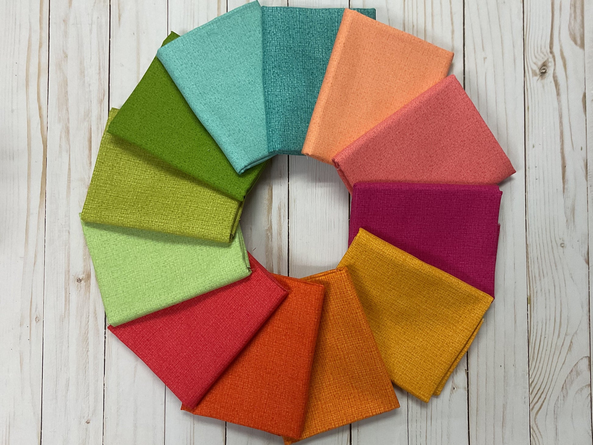 This half yard bundle includes (12) of the following Thatched colors: Brook, Seafoam, Meadow, Spring, Chartreuse, Fuchsia, Sugar Rose, Passion, Clementine, Citrus, Peach, Honeycomb. The California Sunshine bundle is inspired by the MOD Flower Box Quilt Kit in the California Sunshine palette.