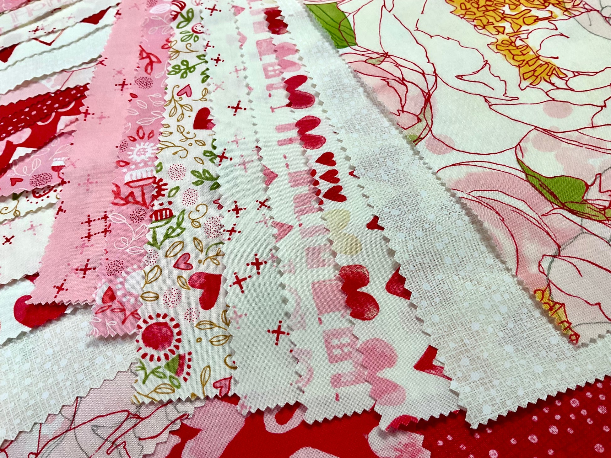 Scrap bags weigh over 1/2 lb. (approximately 10.6 oz!) with scraps of cotton quilting fabrics from the NEW Darling Peony collection, designed by Robin Pickens. Hearts, Houses and of course Peonies on three different backgrounds. This collection is all about the love! Not all the fabrics from the collection are included but photos show the mix of included prints. Pieces range from 1 " wide to 6" wide and about 12-12.5" long. These scraps bags are great for string quilts and scrappy projects. The photos shown are a representation of the fabrics in the bag (perhaps repeat prints) and may vary slightly from this picture, but is fairly accurate to the selection in the bags. This listing is for one 10+oz pack.