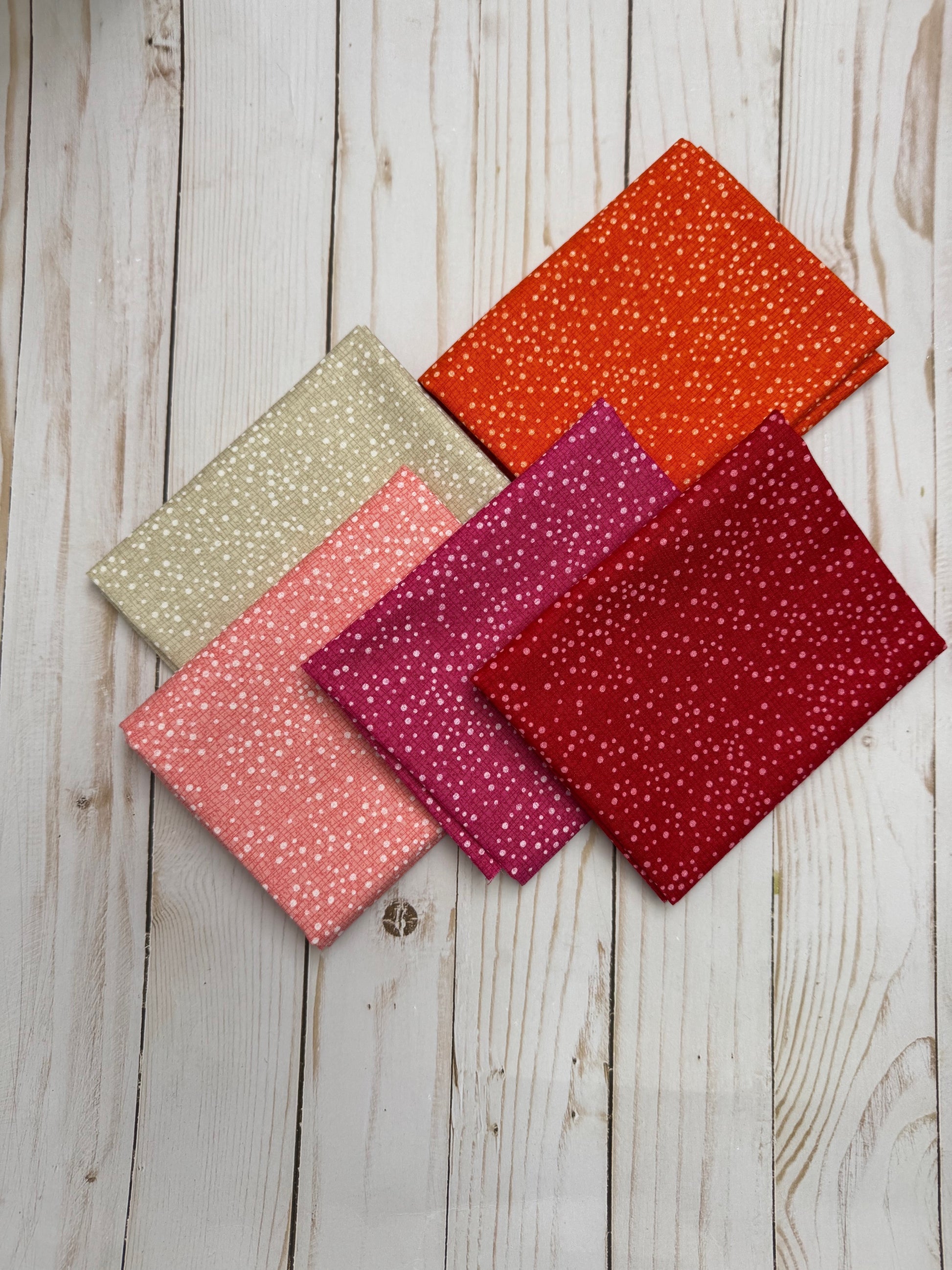 Dotty Happy fat quarter bundle in a warm rosy-red palette, this five-piece fat quarter bundle offers versatile yardage for quilting projects. The Dotty Thatched fabrics pairs beautifully with coordinating prints, making it an excellent choice for traditional and contemporary designs alike. Each fat quarter measures 18" x 21", providing a good amount of fabric for blocks and accents. Perfect for stash building.