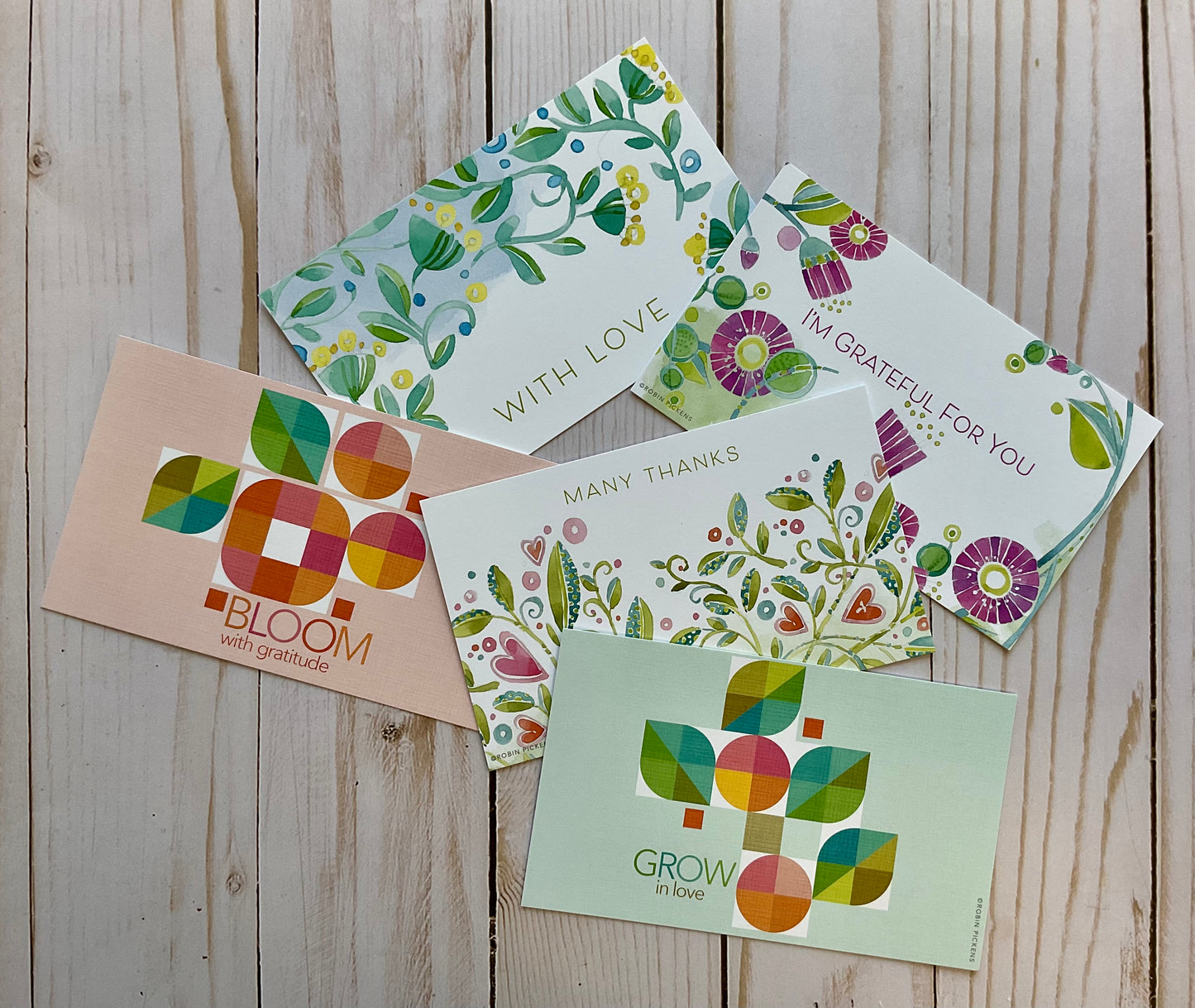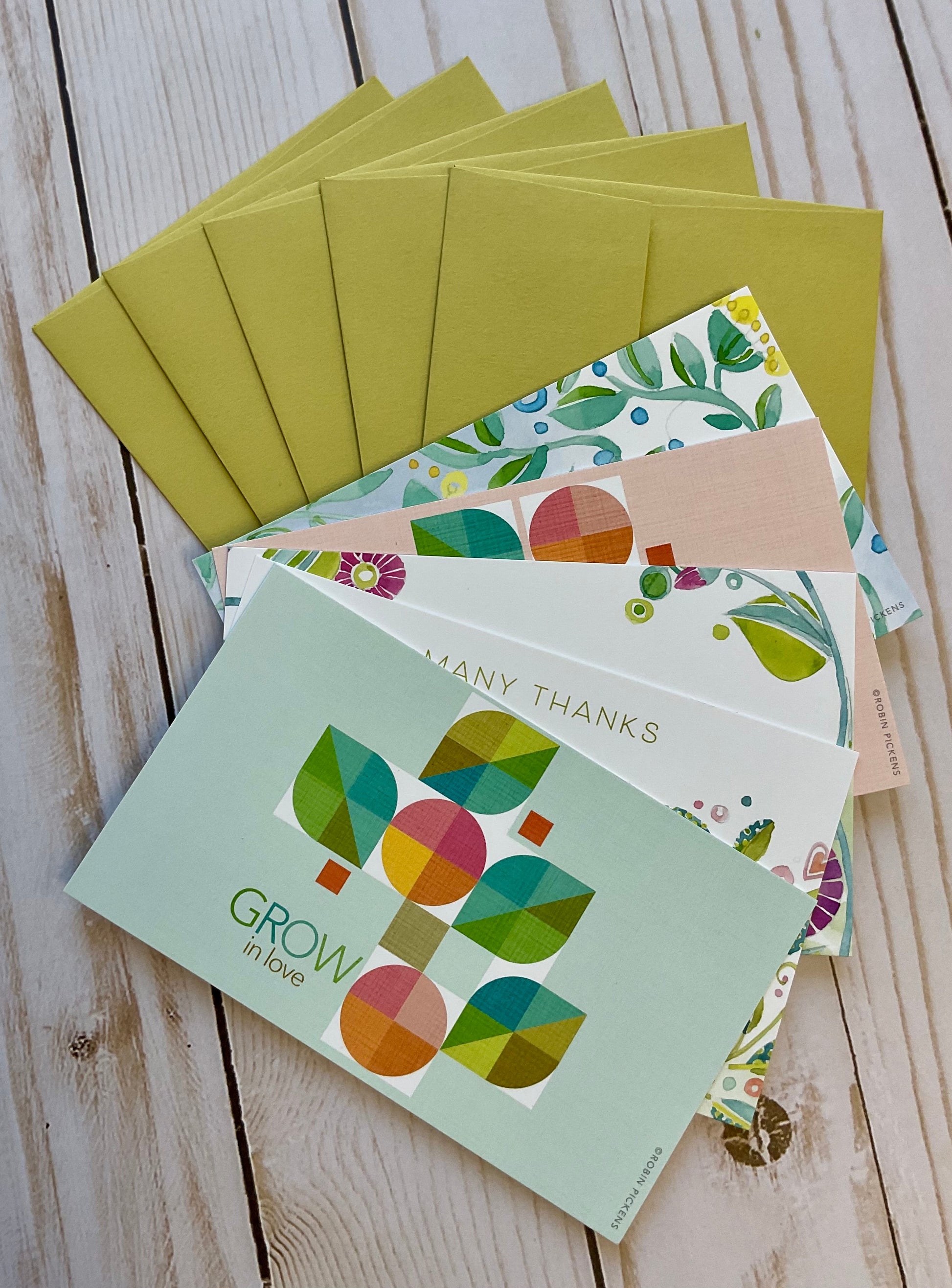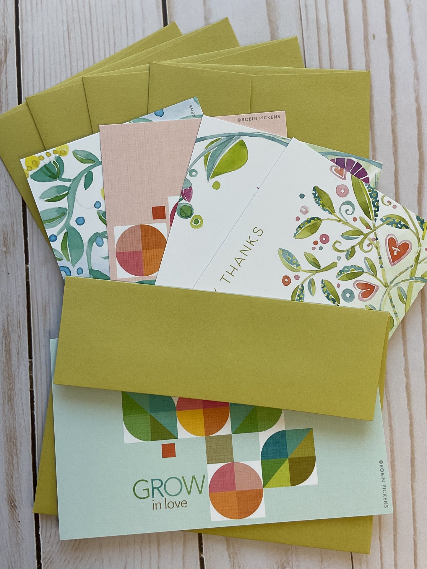 These 3" x 5' greeting cards with golden-green envelopes from Robin Pickens designs can be used for any occasion. Every card has an individual heartfelt saying which makes it easy to add to any celebration or gift.