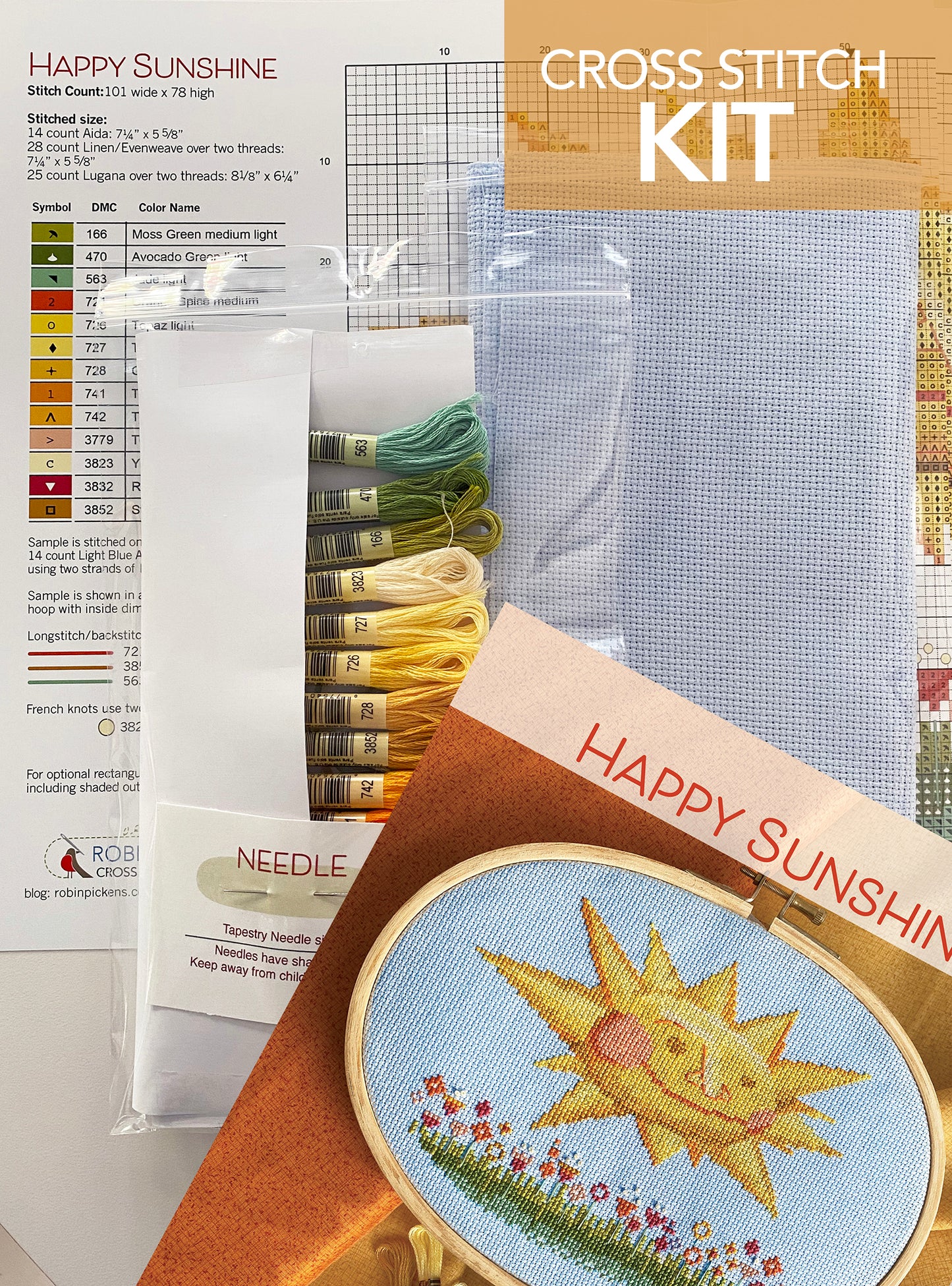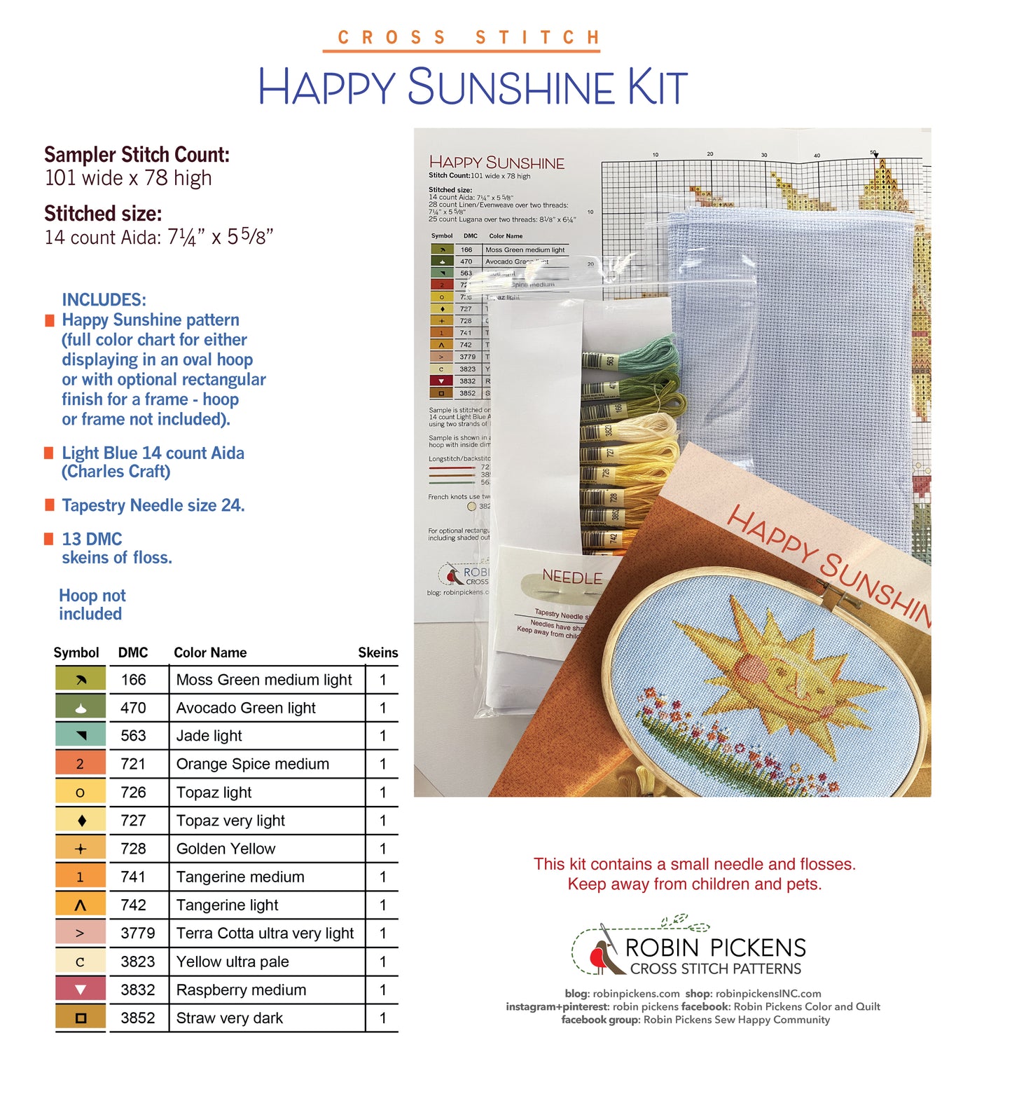 HAPPY SUNSHINE cross stitch comes from my heart! This cheery KIT of the sun is meant to bring you a smile and happy days. The big sun face shines over a cheery lineup of tiny garden blooms. The pattern is designed to either be stitched with an optional straight bottom for a rectangular framing or as shown on the cover in an oval finish or frame (framing is suggested- frame or hoop not included in kit). KIT includes 13 full DMC skeins as specified in the pattern, light blue 14 count Aida, a tapestry needle and printed pattern.