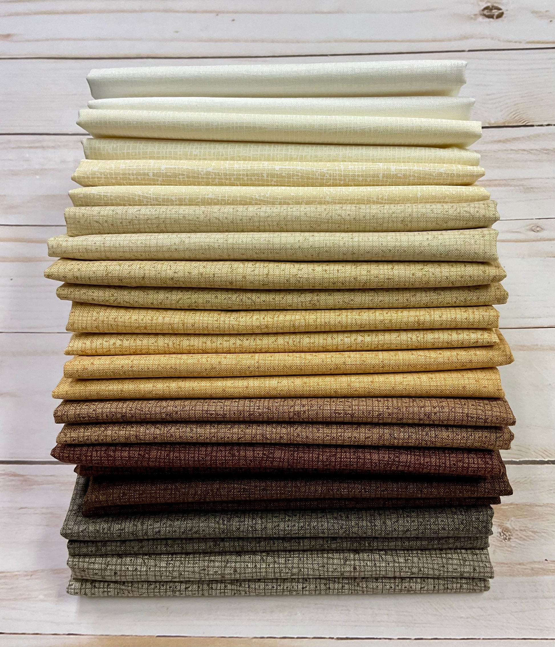 This fat quarter bundle of twelve (12) Thatched basic colors have been chosen to represent the neutral color spectrum. The colors included in this bundle are: Blizzard, Cream, Buttermilk, Washed Linen, Toast, Sandcastle, Caramel, Mocha, Cocoa, Chocolate Bar, Charcoal, and Stone.