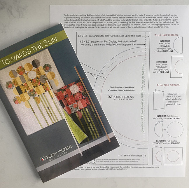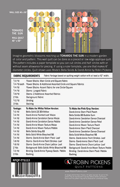Enjoy the modern and graphic garden with circular blooms standing tall. This quilt pattern for TOWARDS THE SUN includes a PDF downloadable pattern by Robin Pickens. This modern wall quilt uses yardage to create a pieced quilt or applique quilt (applique in pink and gray example is raw edge fusible applique but turn-edge can be done as well). A template is included with the pattern for making the 6" circular pieces (it is a separate file you download along with the pattern). If you'd like to use a plastic template ruler, the actual quilts were made using the Creative Grids Circle Savvy Quilt Ruler (CGRSAV1) which could be purchased separately. The pattern is written for a wall size quilt of 40" x 50". Yardage needed is indicated on the back of pattern.