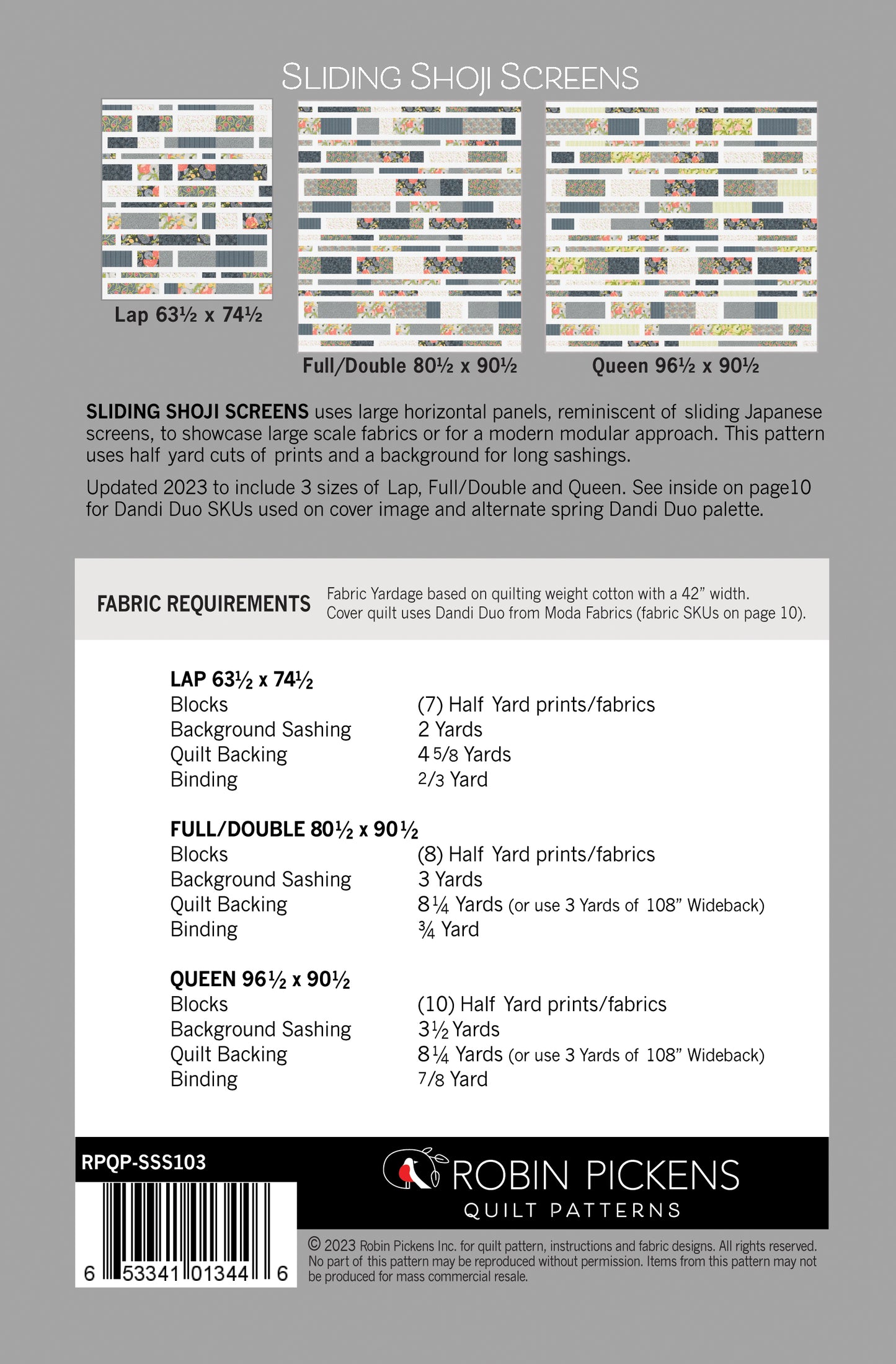 SLIDING SHOJI SCREENS 2.0! This quilt pattern for Sliding Shoji Screens is an updated quilt pattern by Robin Pickens including more sizes. Japanese shoji screens inspired this quilt made up of panels, imagining them sliding to divide spaces. Lap size (63 1/2" x 74 1/2") is most similar in size to the original Sliding Shoji Screens pattern and now pattern includes a Full/Double size of 80 1/2" x 90 1/2" and a Queen size 96 1/2" x 90 1/2". Quilts use either 7 Half Yards, 8 Half Yards, or 10 Half Yards, based on size making, plus sashing fabric. Full yardage needed is indicated on the back of pattern.