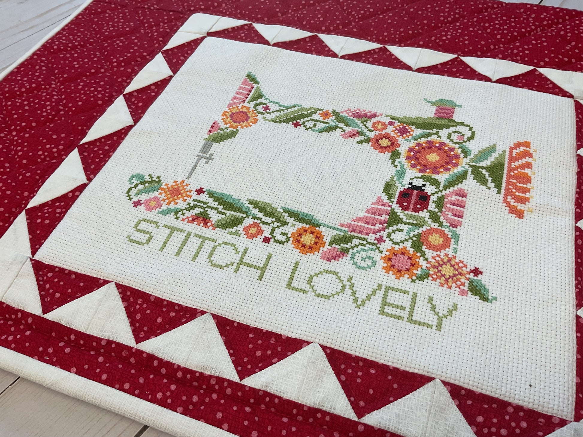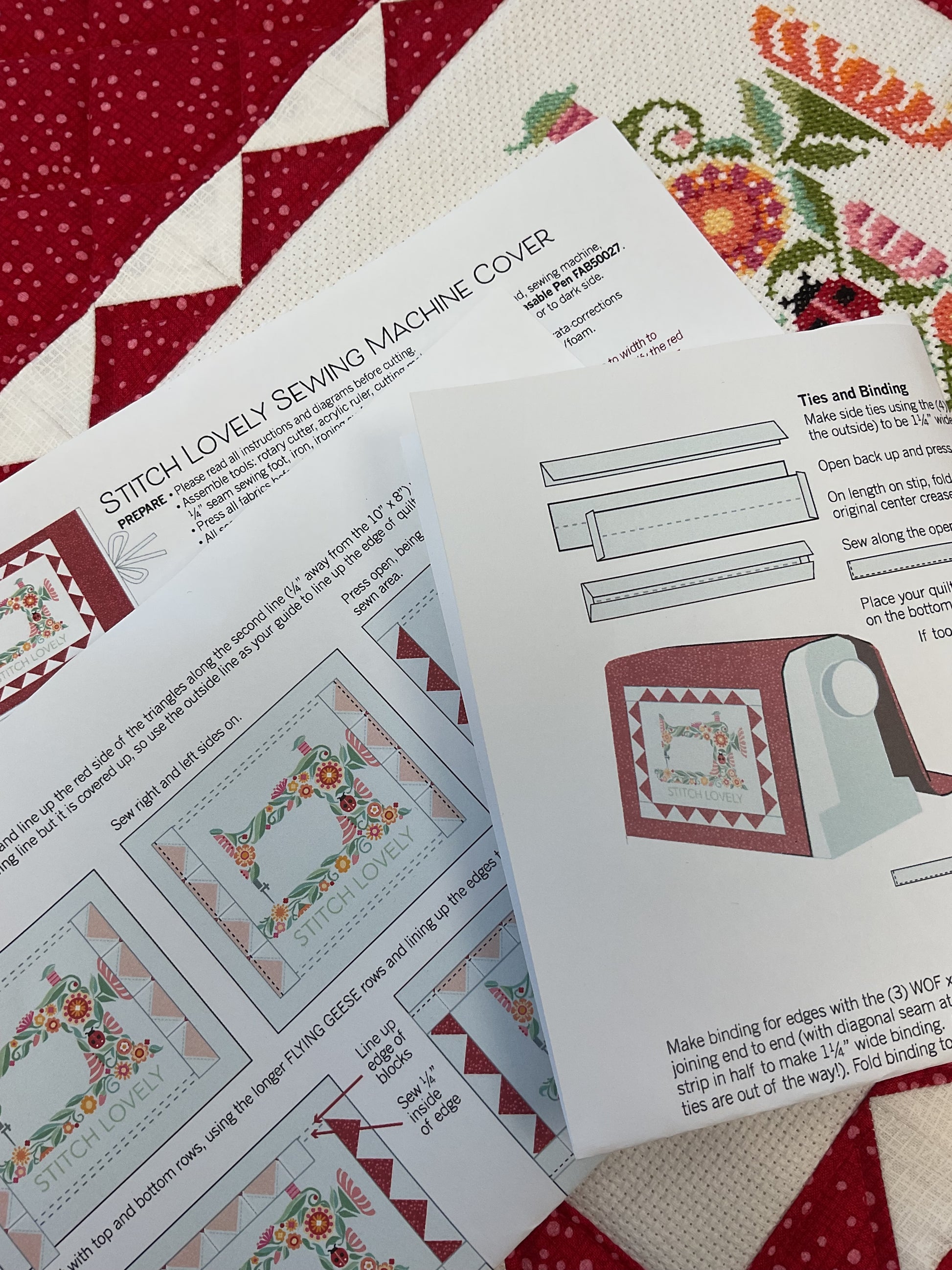 This is the sewing machine cover pattern that is shown with the Stitch Lovely Sewing Machine kit. This pattern explains how to sew the fabrics to the cross stitch and make the cover with open ends, ties and binding.