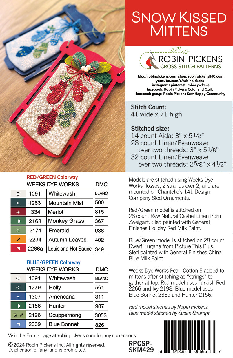 This chart of dangling mittens fits on the ornament-sized sled from Chantelle's 141 Design Company. It was designed for the 2024 mystery box and is now available for general release! This makes a charming set with the Snow Kissed Skates (that use the "small" decor sled, also through Chantelle's 141 Design Company) for a festive wintery pair. I've stitched the mittens in two colorways and both are specified on the pattern, using Week's Dye Works flosses. There is also a DMC conversion listed on back cover.