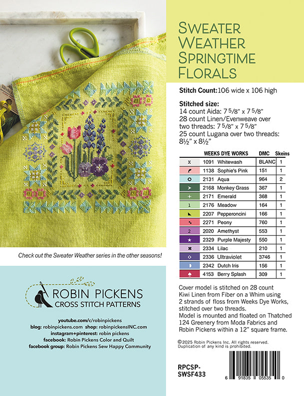 Sweater Weather Springtime Florals is the third release for the Sweater Weather series (featuring quilt block borders in a square format with central motif). This chart is a stitch count of 106 x 106.