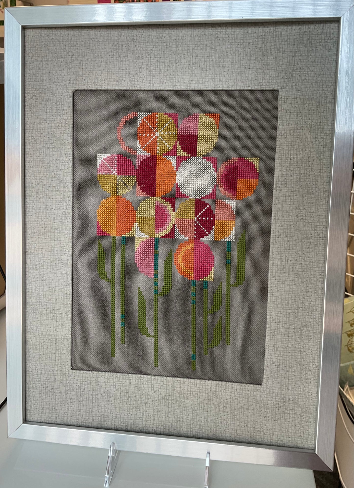 Thatched Grey is from the basics collection designed by Robin Pickens for Moda fabrics. Robin Pickens used this particular Thatched Grey print to finish the Facing the Sun cross stitch project as seen on the cover of the pattern. See also the picture below of the finished project.